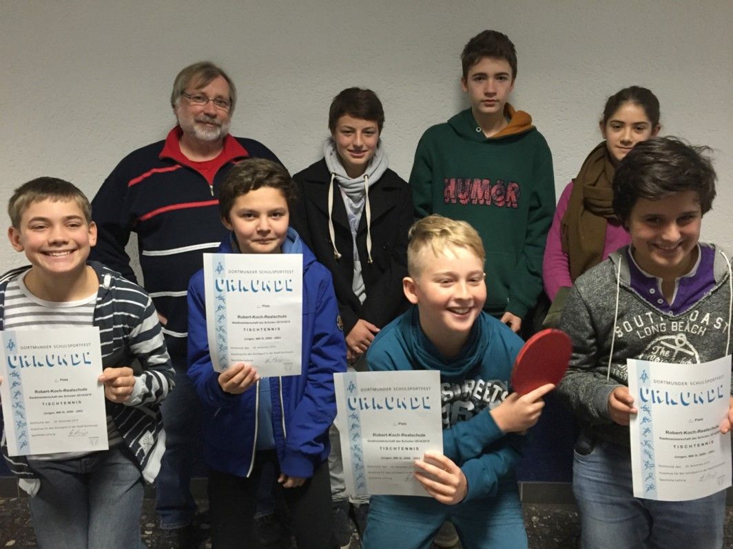 Erstmals versuchte sich die Hombrucher Robert-Koch-Realschule bei den Schulstadtmeisterschaften in 2014 auch im Tischtennis. In der von Herrn Wolfgang Kaminski betreuten Truppe war viel Potenzial vorhanden, da etliche Vereinspieler im Team waren. Die Jungen-Mannschaft (8a, 8b, 7a, 6a) wurde durch eine Spielerin verstärkt und gewann in der Wettkampfklasse III (1998-2001) gegen das Immanuel-Kant-Gymnasium den Stadtmeistertitel. In der Halle am Ostwall trumpfte die RKR mit 9:0 Spielen und bei 27:0 Sätzen deutlich auf. Gespannt fiebern wir den Regional-Wettkämpfen in Herne im Dezember 2014 entgegen.