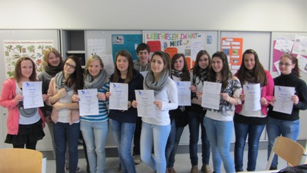 Schülerinnen und Schüler des 8nb Biologie-Neigungskurses wurden für ihre erfolgreiche Teilnahme am Wettbewerb „Chemie entdecken“ mit einer Urkunde geehrt. Rund um das Thema „Kau Gummi!“ haben sie verschiedene Versuche durchgeführt und protokolliert. Unter anderem mussten Kaugummiblasen erzeugt, die Elastizität von Kaugummis und Luftballons verglichen und Methoden zur optimalen Entfernung von Kaugummis erforscht werden.