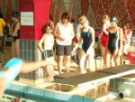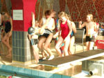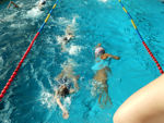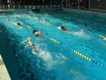 Schwimmer einer Mannschaft gleichzeitig auf einer Bahn und versuchen in den 10 Minuten möglichst viele Bahnen zu schwimmen). Hier