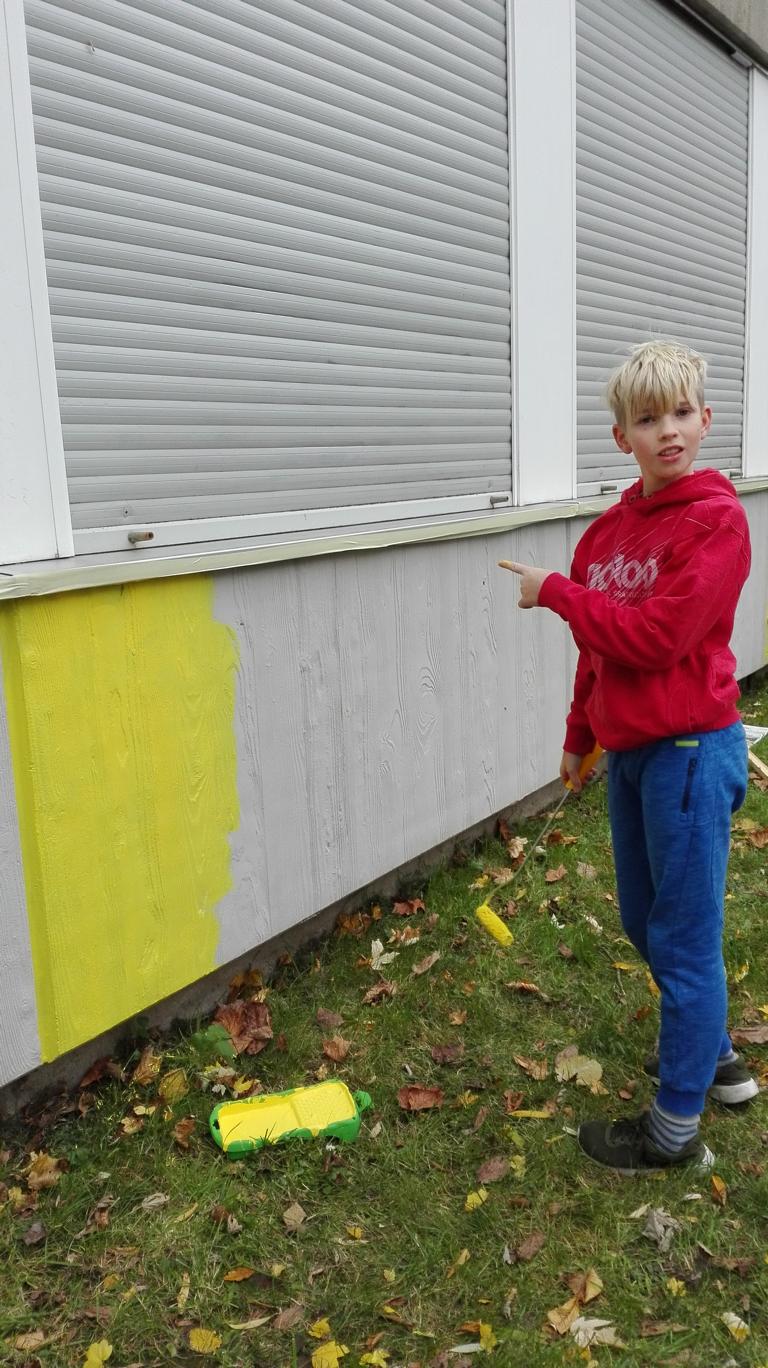 Aktuell sind durch SchülerInnen der 7a auch die ersten Fassadenflächen in Angriff genommen worden. Da die Schule schlicht und im Betoncharme der 1960er Jahre errichtet wurde und bisher nur in betongrau „strahlte“, legten die Siebtklässler – die als damalige Sechstklässler großen Anteil am Entscheidungsprozess hatten - nun selbst Pinsel und Rolle an. Dazu der 7a-Klassensprecher Kobe „Ich finde es schön, dass die Schule es ermöglicht hat, dass wir das Schulgebäude so schön anmalen durften, es ist nun viel freundlicher!“ Da die Resonanz auf die Farbflächen bisher ausgesprochen positiv ist, werden bald andere Fassadenelemente auch farbenfroh gestaltet werden.
