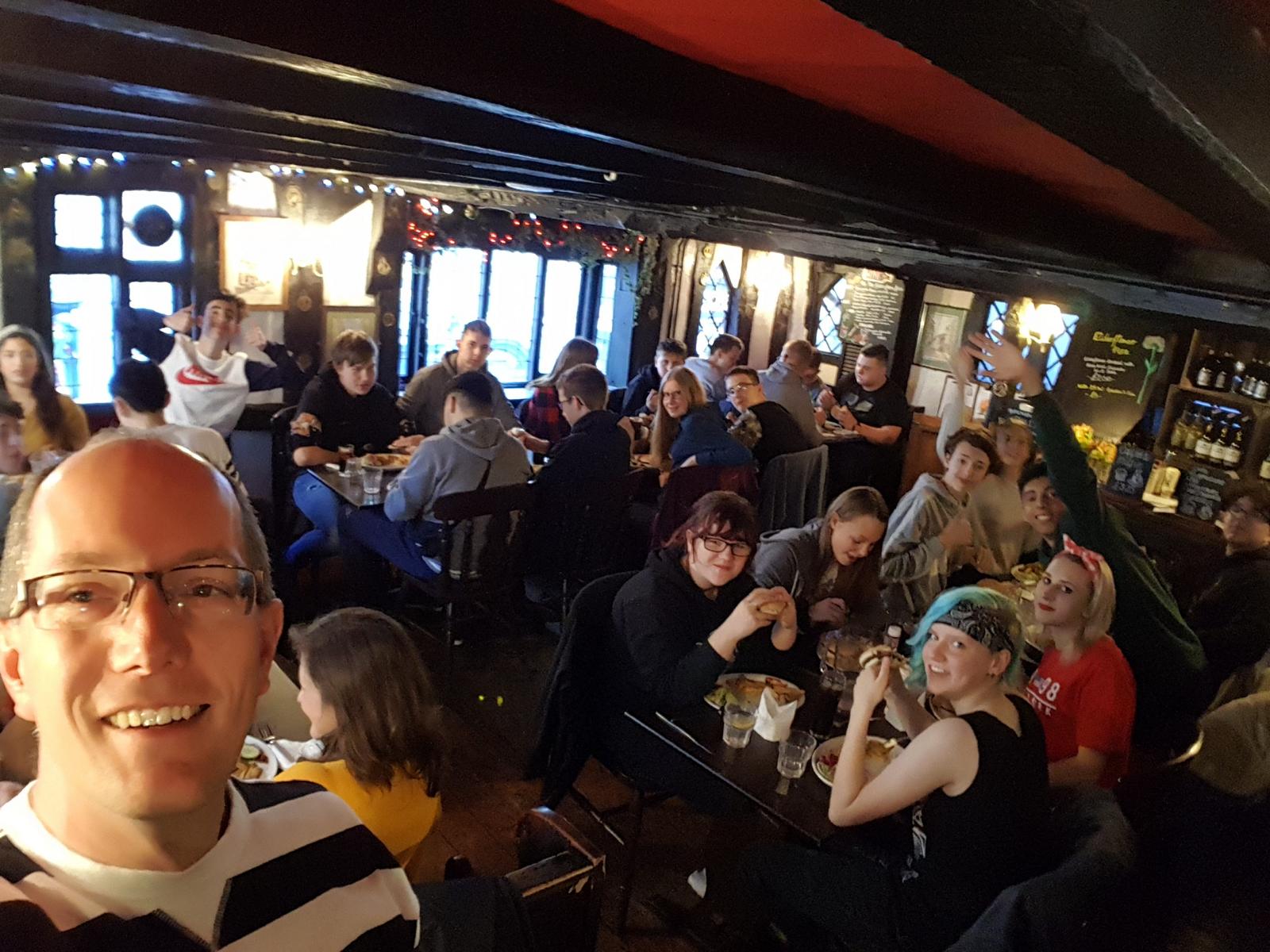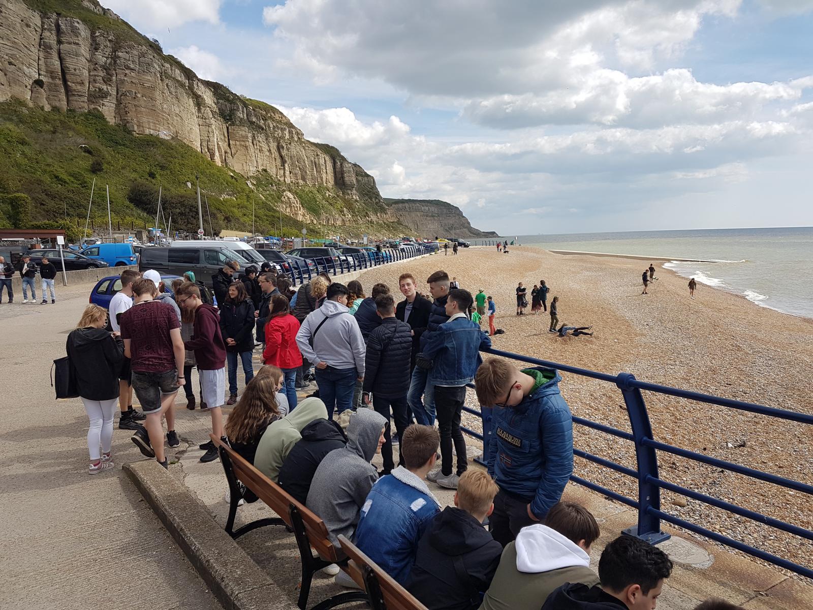 Vom 05.05. bis zum 11.05.2019 haben die Klassen 9a und 9b zusammen eine Klassenfahrt nach Hastings gemacht. Am Sonntag, den 05.05. sind wir morgens um 8 Uhr an der Schule aufgebrochen und haben nach einer entspannten Überfahrt von Calais nach Dover gegen 18 Uhr Ortszeit Hastings erreicht. Am Montag haben wir dann Hastings erkundet, was gar nicht so leicht war, da es ein "Bank holiday" namens "Jack in the green" war. Es liefen allerlei Leute mit grünem Blattwerk verkleidet durch die Stadt und nebenher war noch Motorradtreffen, so dass Hastings vollgestopft war mit rund 20.000 Motorrädern jeder Art.