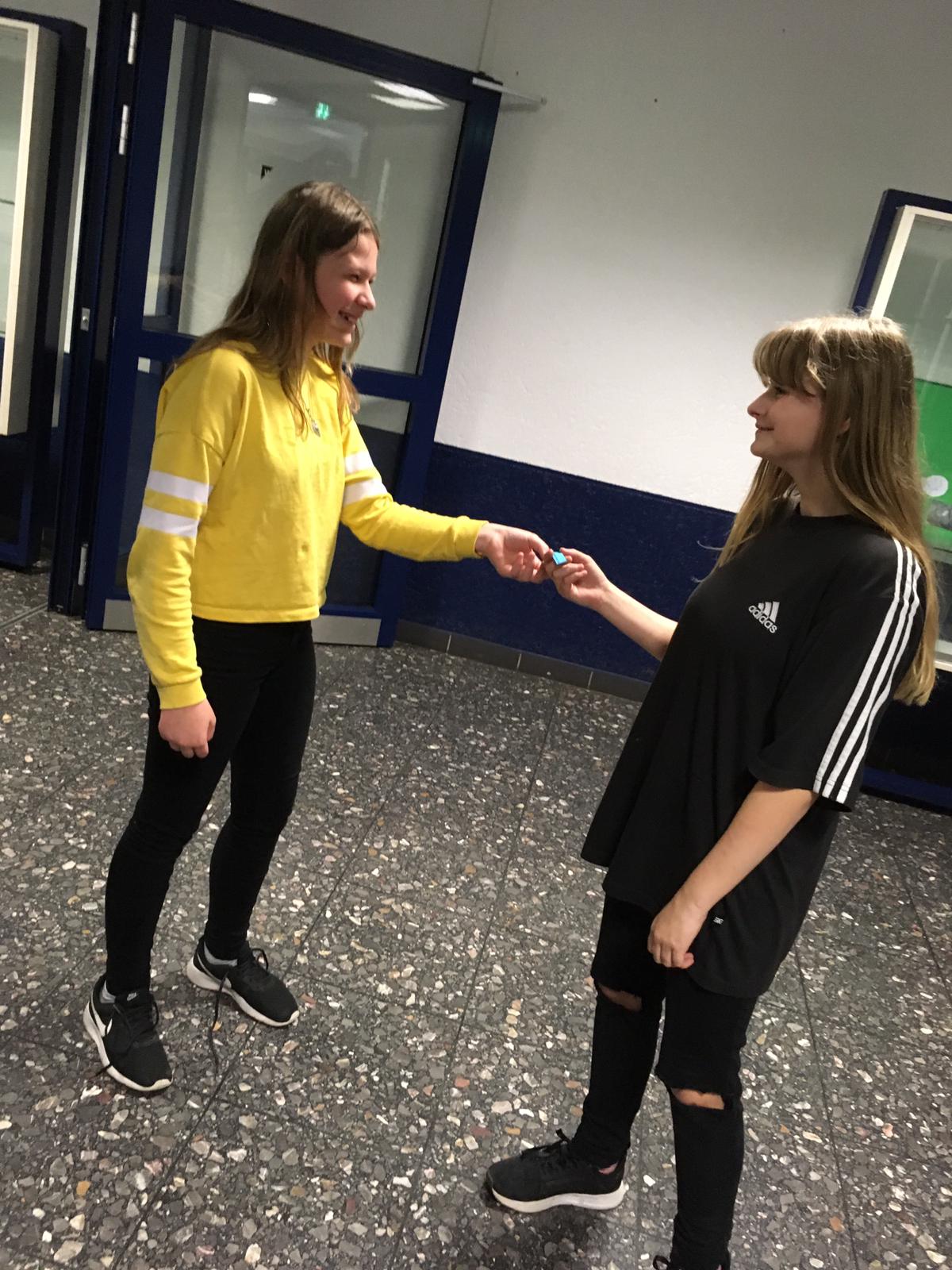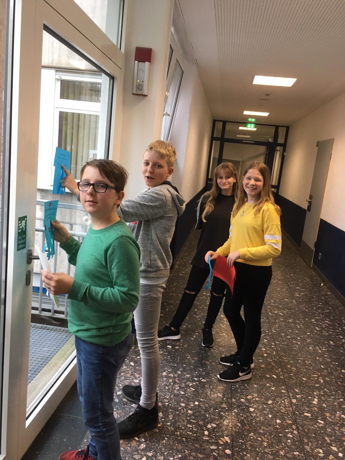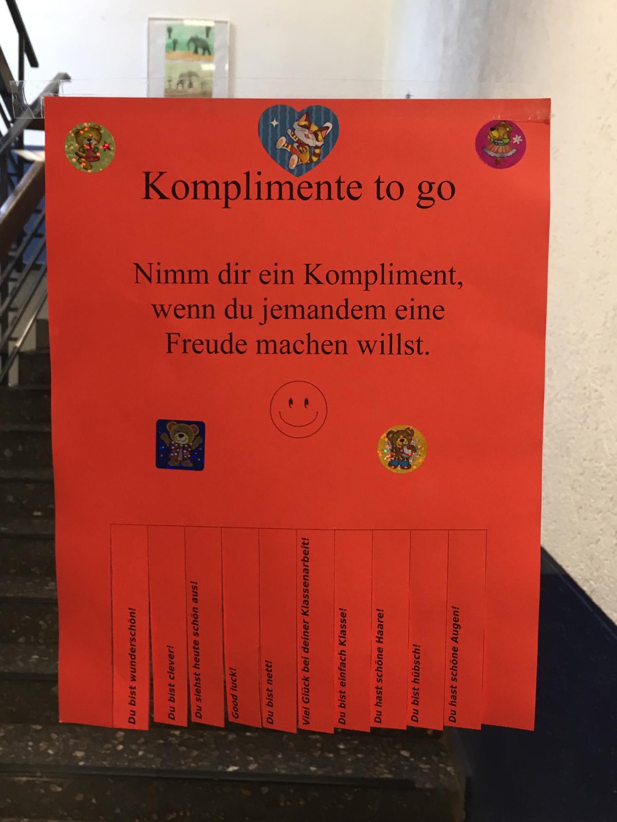Im Rahmen der Aktion "50 gute Taten" hat die Klasse 7b kleine Plakate erstellt mit Komplimenten zum Abreißen. Diese haben sie dann im gesamten Schulgebäude aufgehängt. Schüler der RKR hatten so die Möglichkeit, mit einem abgerissenen Kompliment einem Mitschüler oder einer Mitschülerin eine kleine Freude zu machen. Eine kleine Geste mit einer großen Wirkung.