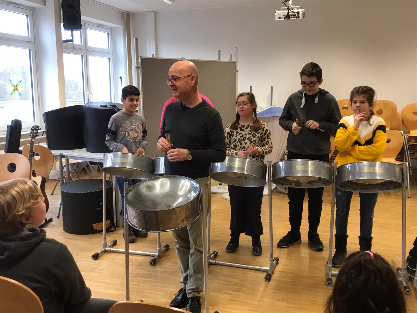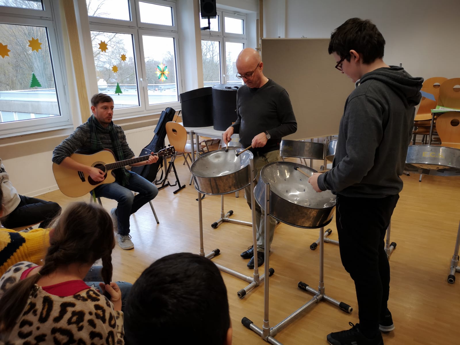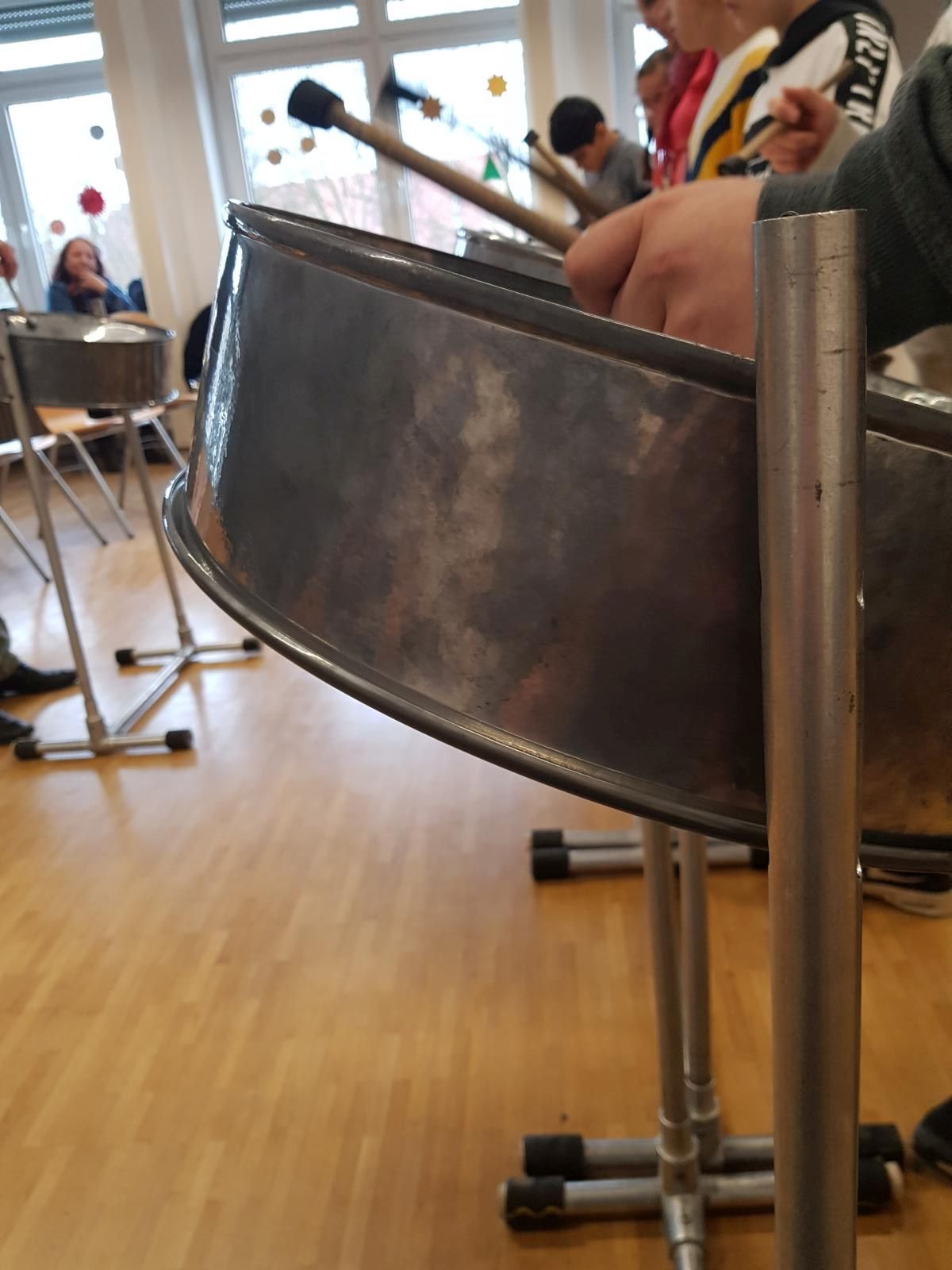 Unter der Leitung des Musikers Jürgen Lesker vom Verein „Pankultur“ hatten einige Schülerinnen und Schüler der Jahrgangsstufe 5 in den letzten Wochen die Möglichkeit innerhalb eines Workshops die Steelpan kennenzulernen und auszuprobieren. Das Besondere an diesem Instrument ist die schnelle Einstiegsmöglichkeit ohne musikalische Vorkenntnisse. So konnten die Schülerinnen und Schüler erste Erfahrungen in Rhythmus und Spieltechnik sammeln. Im Vordergrund des Workshops stand jedoch das gemeinsame Musizieren und natürlich der Spaß an der Sache. Am Montag war es dann so weit: Einem kleinen Publikum wurde das Lied „Egyptian Reggae“ vorgetragen und sorgte für gute Laune bei allen Beteiligten.