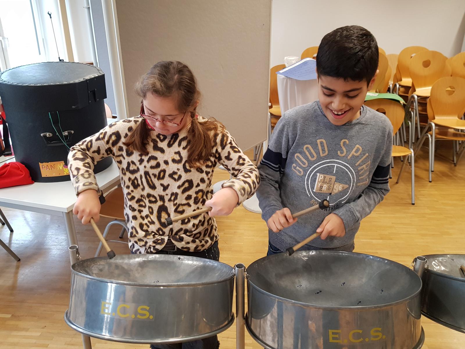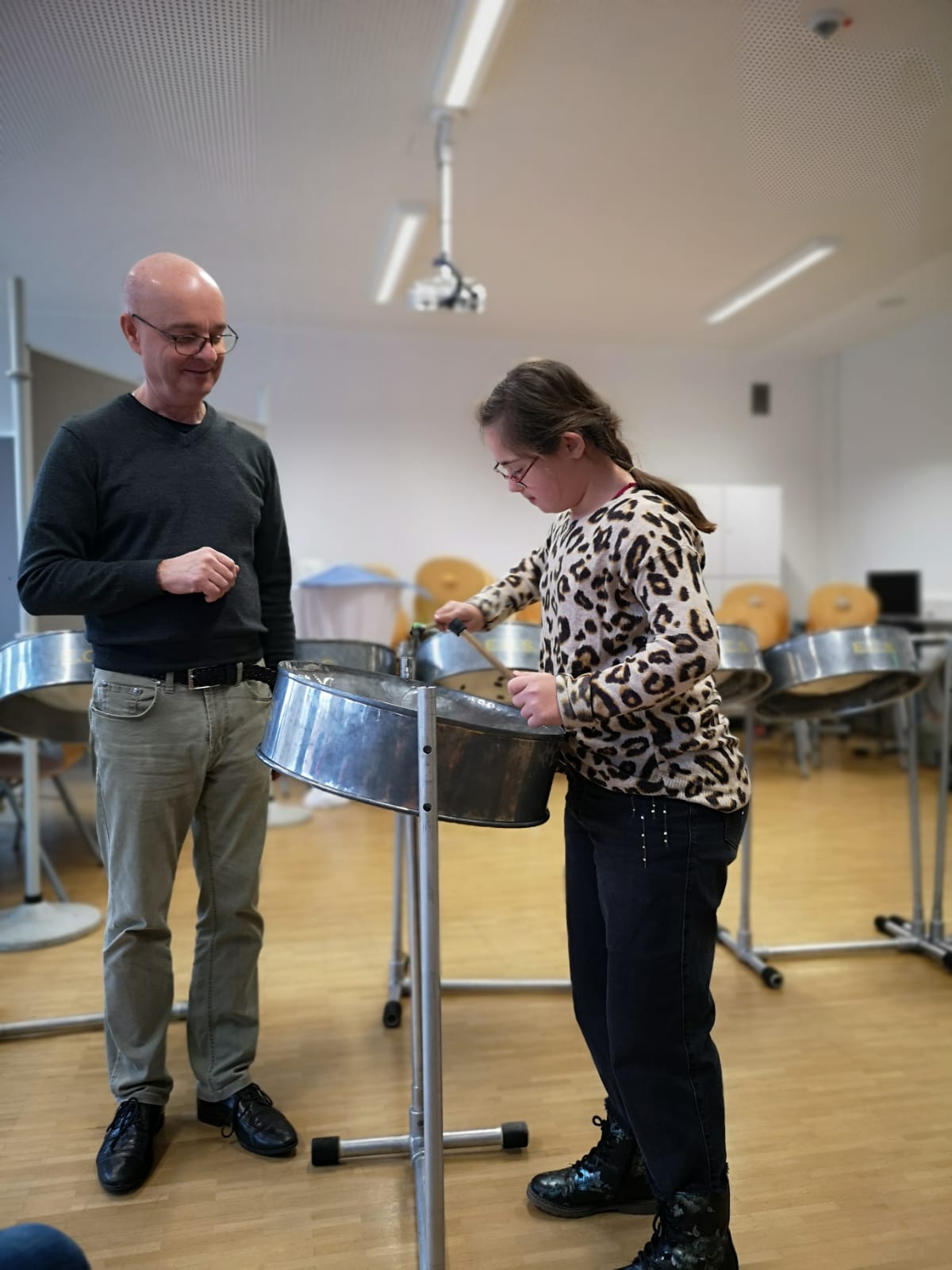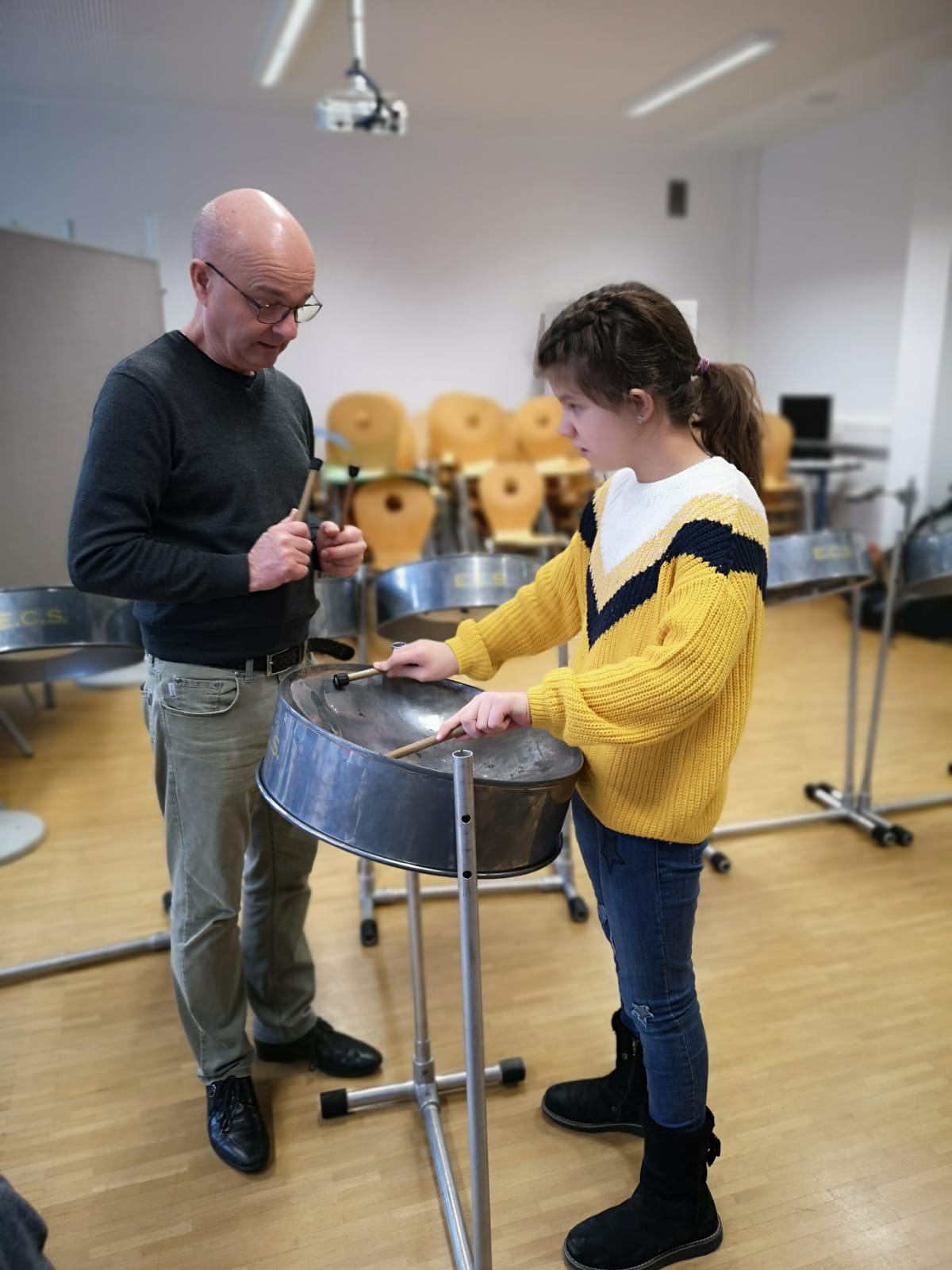 Unter der Leitung des Musikers Jürgen Lesker vom Verein „Pankultur“ hatten einige Schülerinnen und Schüler der Jahrgangsstufe 5 in den letzten Wochen die Möglichkeit innerhalb eines Workshops die Steelpan kennenzulernen und auszuprobieren. Das Besondere an diesem Instrument ist die schnelle Einstiegsmöglichkeit ohne musikalische Vorkenntnisse. So konnten die Schülerinnen und Schüler erste Erfahrungen in Rhythmus und Spieltechnik sammeln. Im Vordergrund des Workshops stand jedoch das gemeinsame Musizieren und natürlich der Spaß an der Sache. Am Montag war es dann so weit: Einem kleinen Publikum wurde das Lied „Egyptian Reggae“ vorgetragen und sorgte für gute Laune bei allen Beteiligten.
