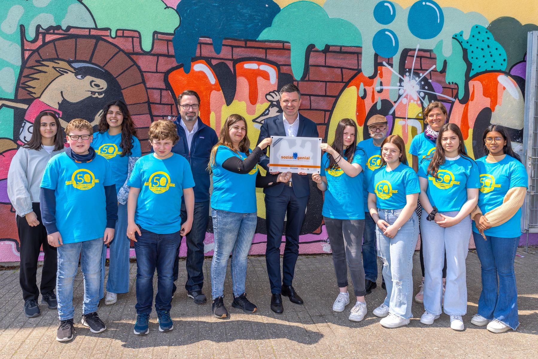 Mit einer eigenen Arbeitsgemeinschaft führt die RKR seit 2019 enrenamtliche Projekte durch. Um diese Arbeit zu unterstützen, übergab Carsten Jäger, Leiter Unternehmenskommunikation der Dortmund Volksbank, nun einen symbolische Spendenscheck in Höhe von 500 € aus dem "sozialgenial hilft"-Förderfonds an Vertreterinnen und Vertreter der Schule