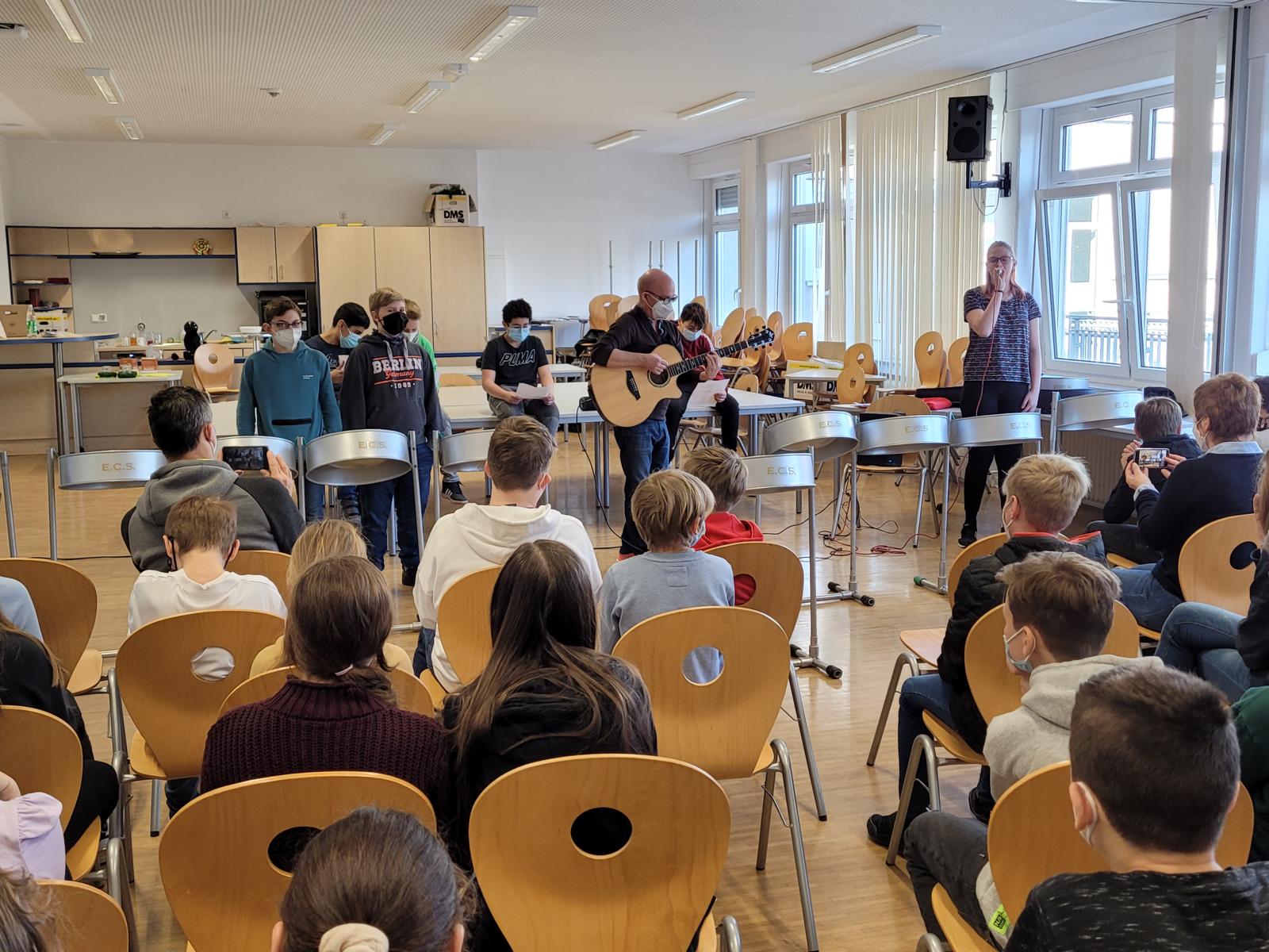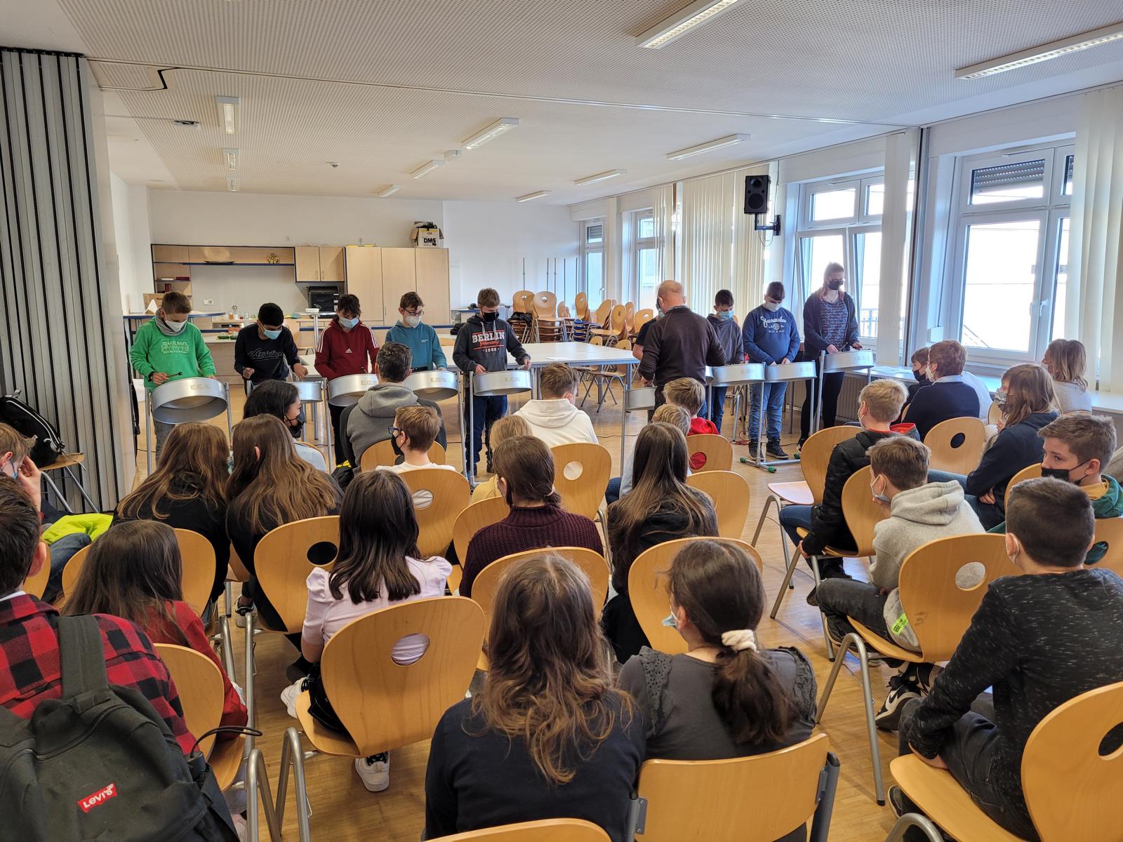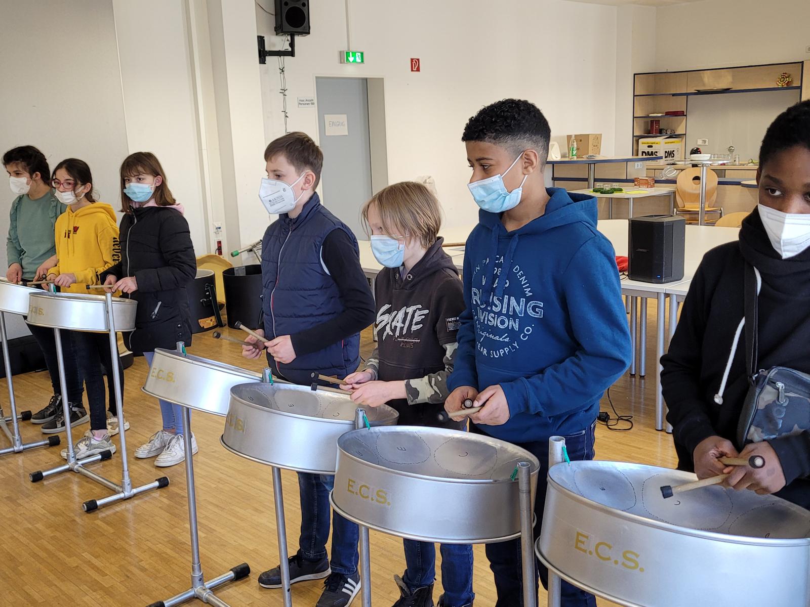Die Teilnehmerinnen und Teilnehmer des inklusiven Steeldrumworkshops sorgten am Freitag für Karibikflair im Feierraum. Unter der Leitung des Dortmunder Steelpanisten Jürgen Lesker wurden Stücke, wie „Mondflug“, „Egyptian Reggae“ und „Drunken Sailor“ eingeübt und im Rahmen eines kleinen Konzerts einigen Schülerinnen und Schülern dargeboten. Besonders gut kam beim Publikum die akustische Coverversion von Sarah Connors „Wie schön du bist“ an. Samanthas ausdrucksstarke Stimme, sowie der Backgroundgesang der anderen Protagonisten wurde mit viel Applaus belohnt.
