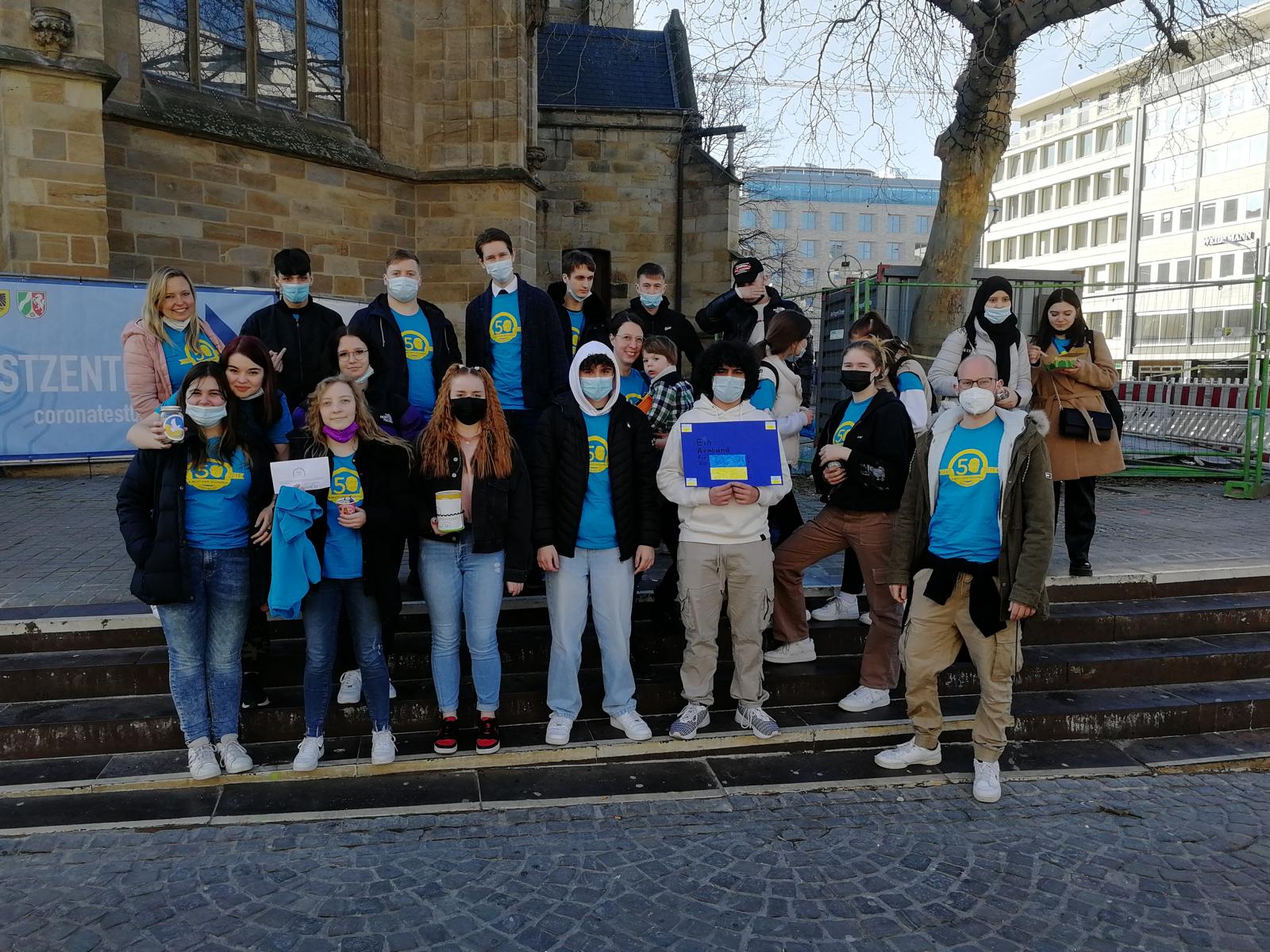 Im Vorfeld hat die Klasse 10c ganz fleißig in den Farben der Ukraineflagge Freundschaftsbändchen geknüpft, die sie am 09.03.2022 in der Dortmunder Innenstadt gegen eine Spende für die Menschen in der Ukraine gesammelt hat. Die Schülerinnen und Schüler konnten viele Passanten erfolgreich zu einer Spende überreden, sodass 190 Euro Spendengeld zusammen kamen. Wir danken allen Passanten, die gewillt waren und sind, den Menschen in der Ukraine zu helfen.