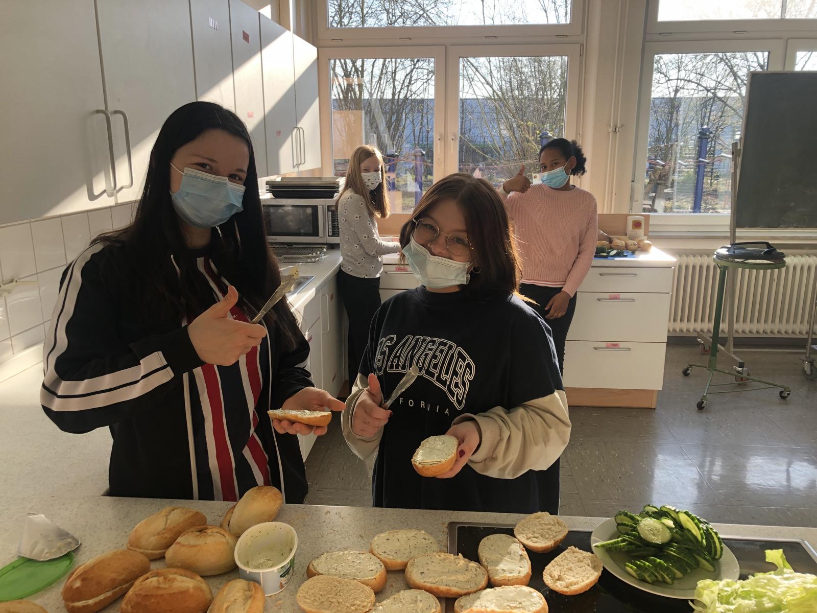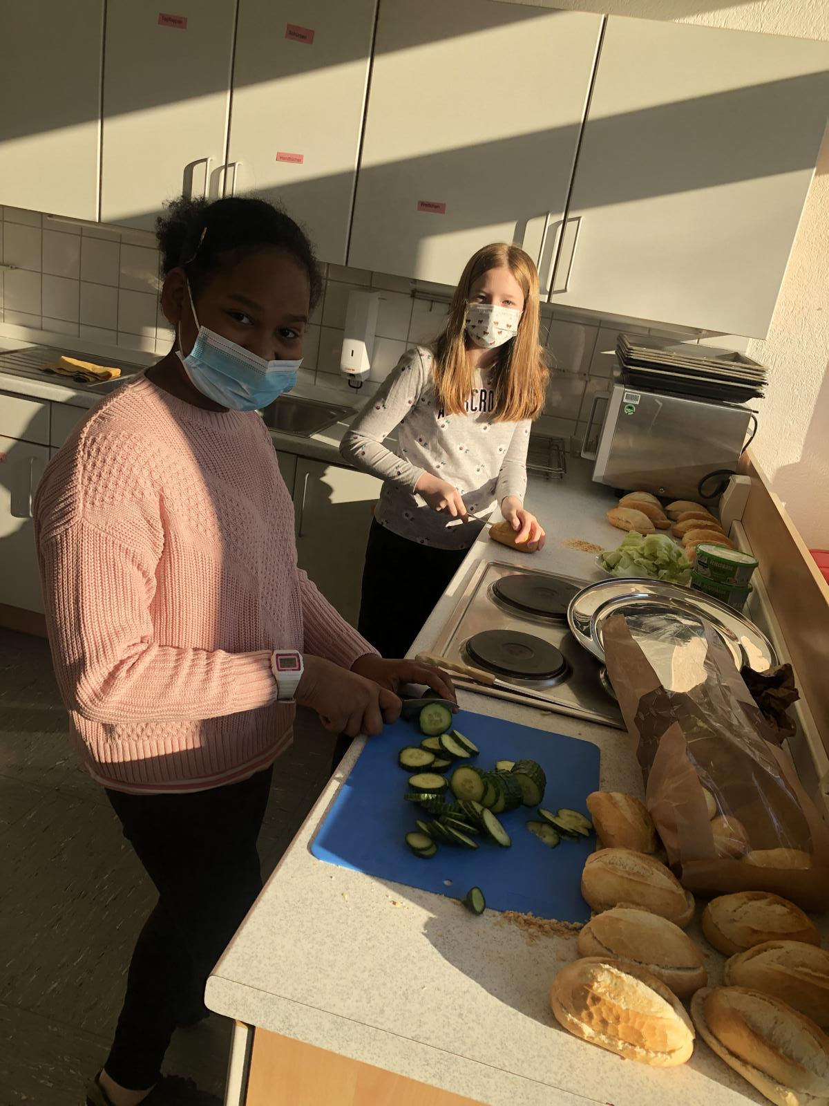 Dieses Mal verzichteten wir auf Nutella und Co und belegten fleißig Brötchen mit Frischkäse, Salat und Gurke. Der Spaß beim Schmieren war garantiert und freudig ging es zum Verkauf auf den Pausenhof. Unsere Spendenkasse für die Ukraine-Kriegsopfer füllte sich schnell und gut - einen herzlichen Dank dafür, Eure Koch AG!