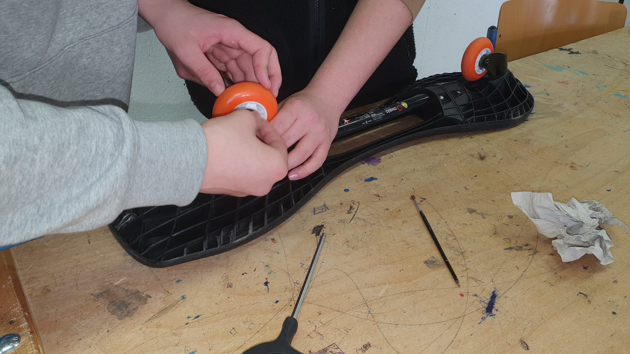 Optimale Vorbereitung auf das anstehende Betriebspraktikum. Die Technikerinnen und Techniker des 9. Jahrgangs reparieren die Waveboards. Nach der Entfernung von Staub und Flusen laufen alle Waveboards wieder reibungslos.