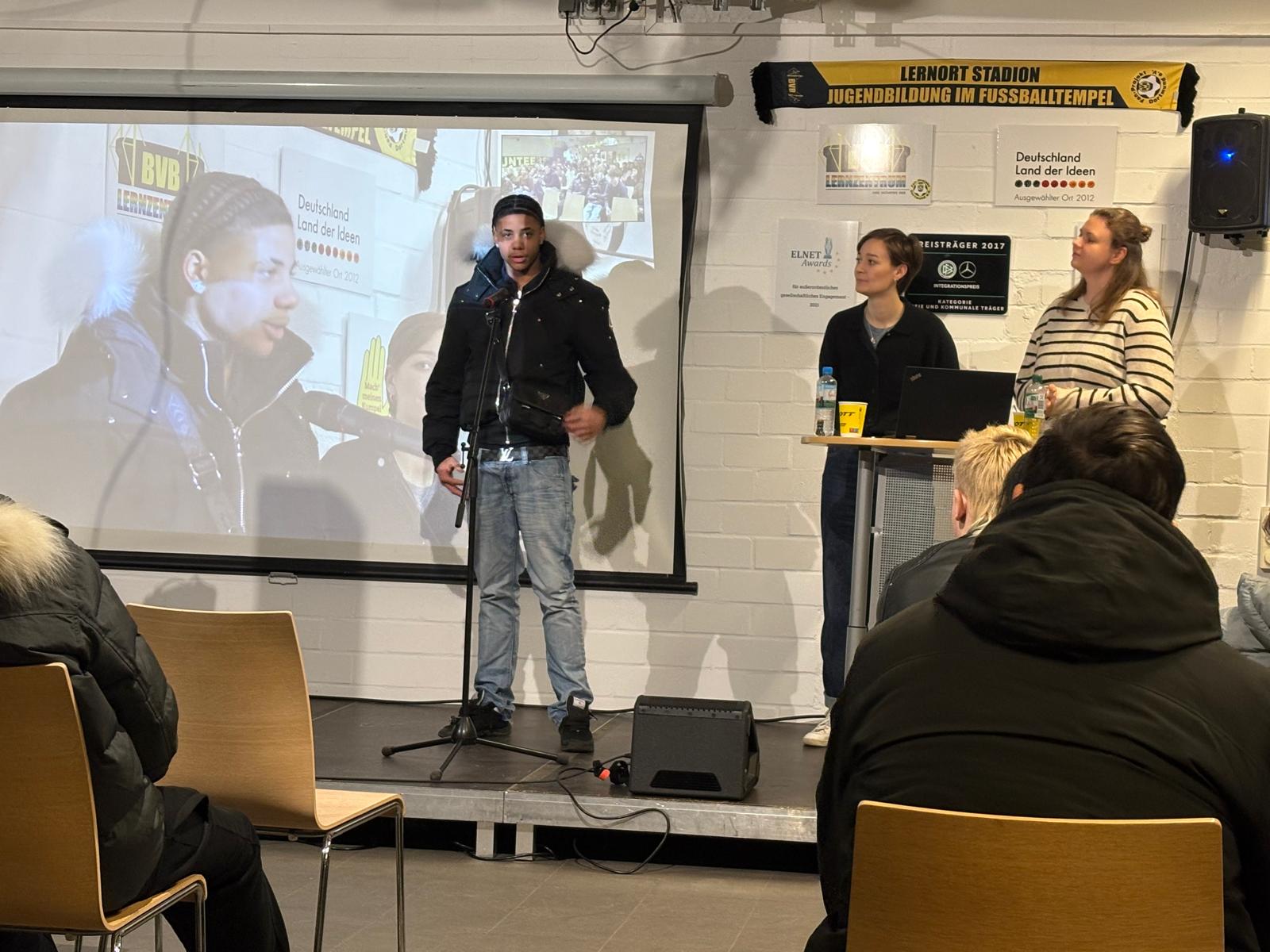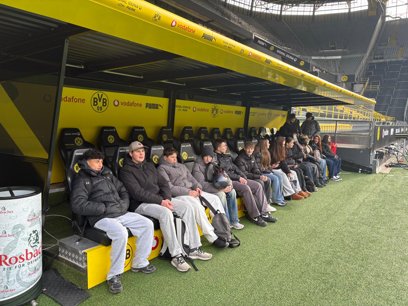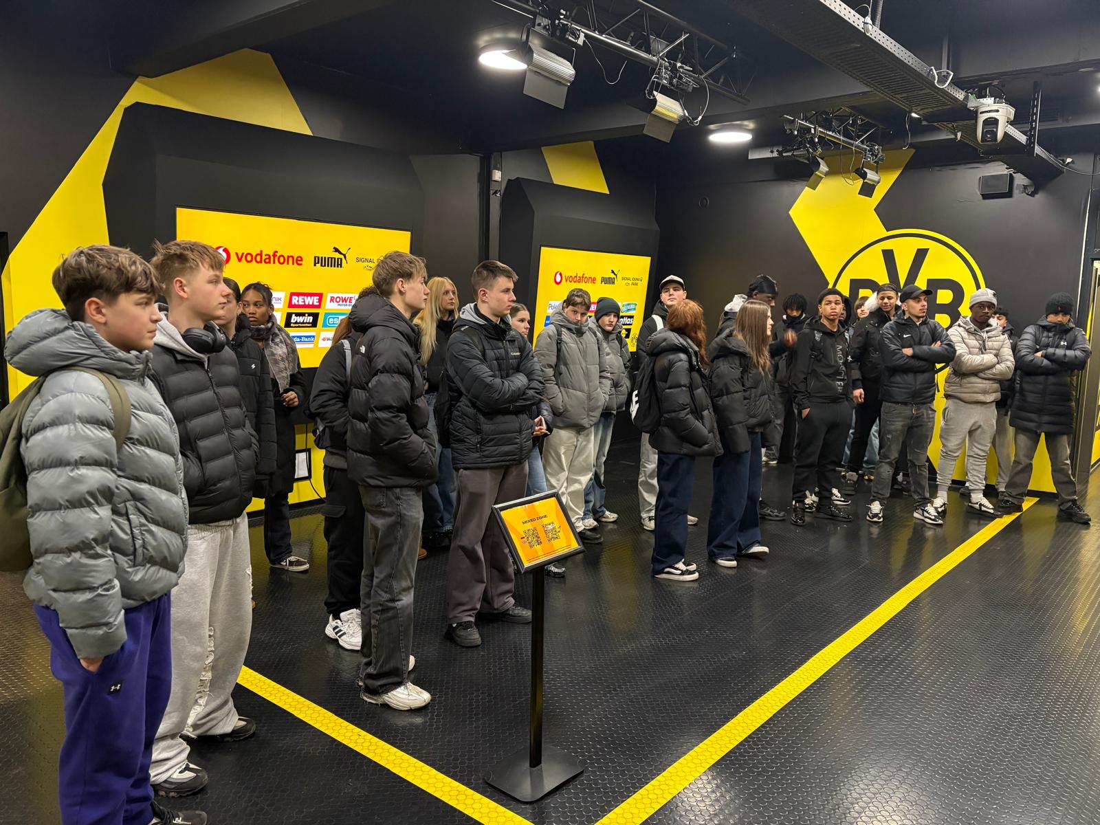Die Klasse 9a war am Mittwoch und am Freitag im Rahmen von „Fußball, Erinnerung, Verantwortung: Ein Workshop- und Begegnungsprojekt zur Geschichte der Familie Hirsch“ im BVB-Lernzentrum zu Gast, um Zweitzeugen:innen von Julius Hirsch, Nationalspieler und von den Nationalsozialisten verfolgter und im KZ ums Leben gekommener Jude aus Karlsruhe, zu werden.