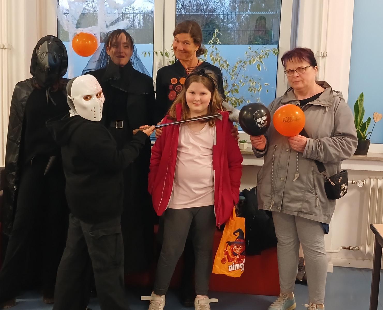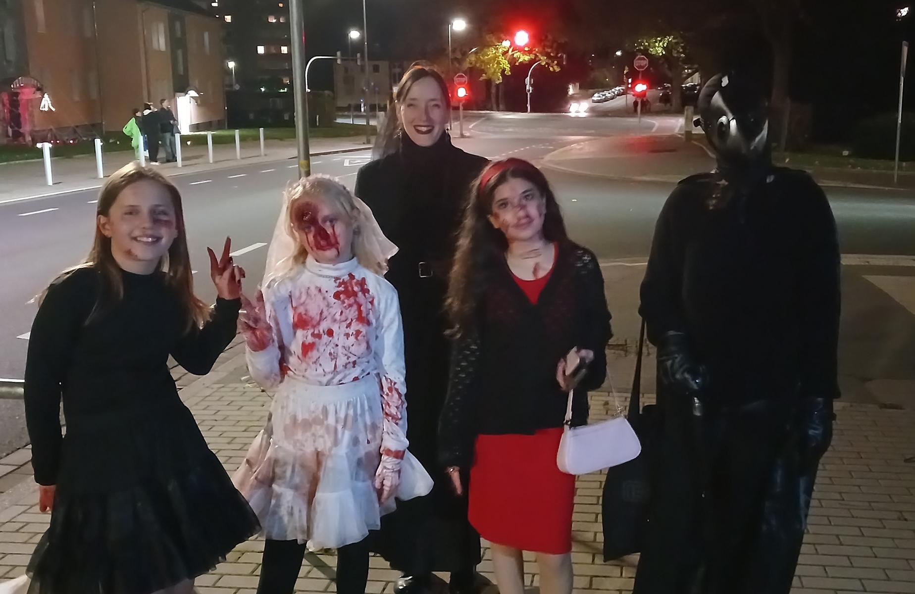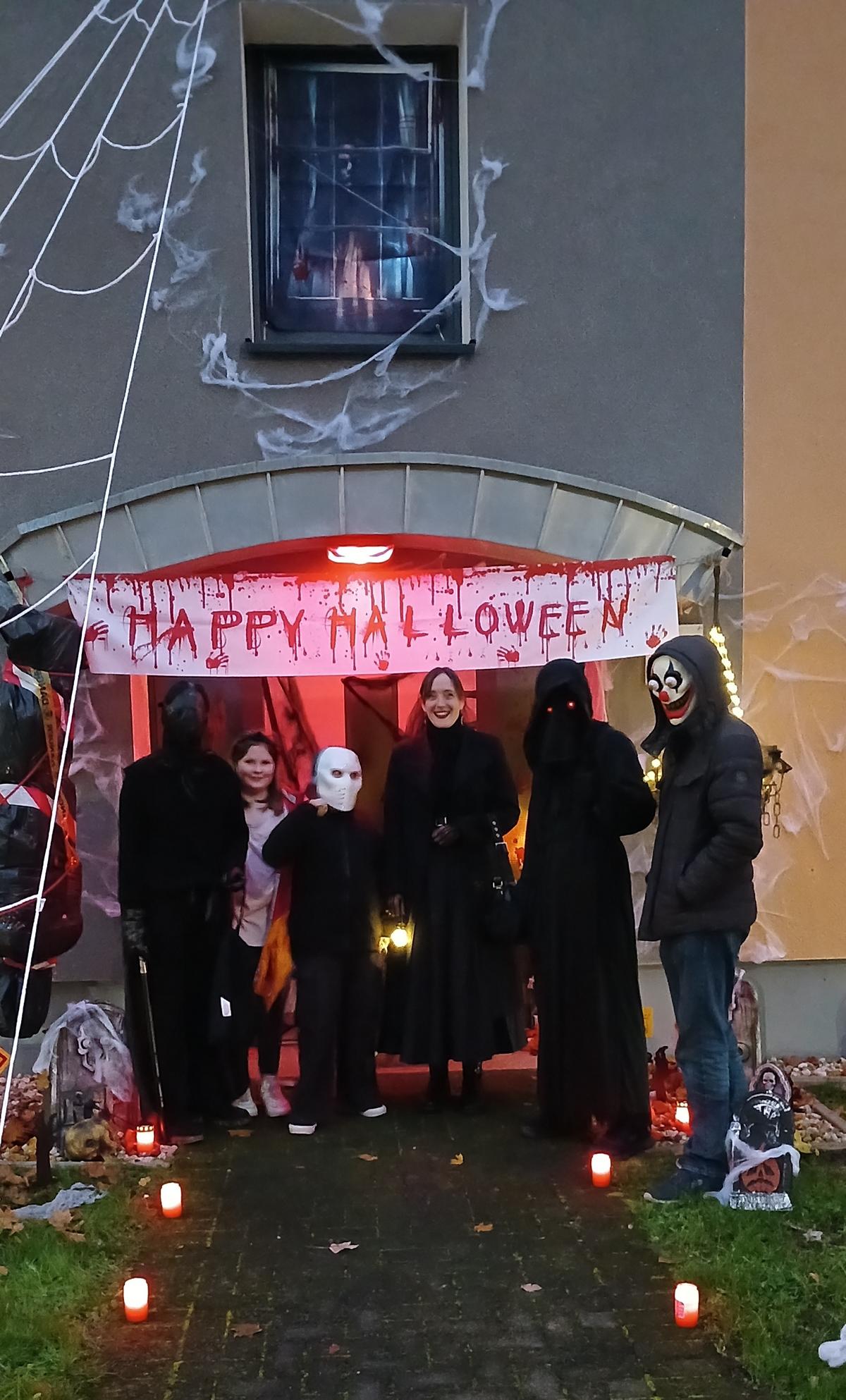 Gut gestärkt ging es bei Anbruch der Dunkelheit von der RKR über den Hombrucher Friedhof und dann durch Siedlungen rund um die City. Allen voran leuchtete uns die Lampe des schön schaurigen Pestdoktors! Auch dieses Jahr bewährte sich "Süßes oder Saures" - die Taschen wurden reichlich gefüllt!