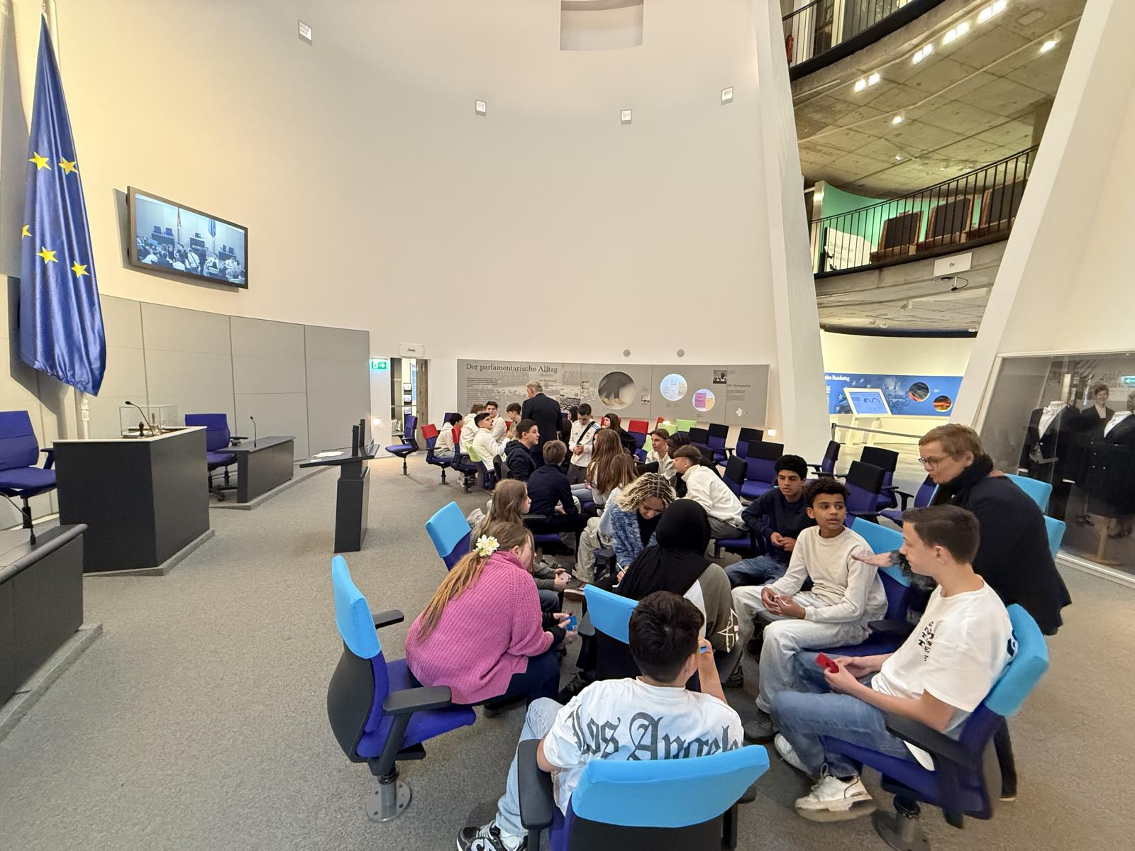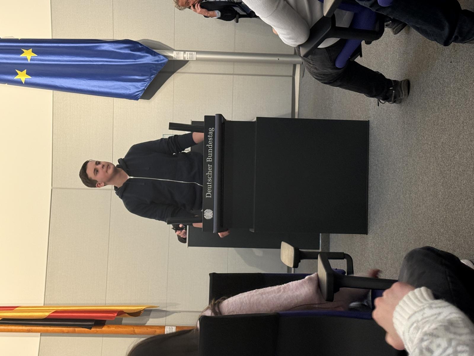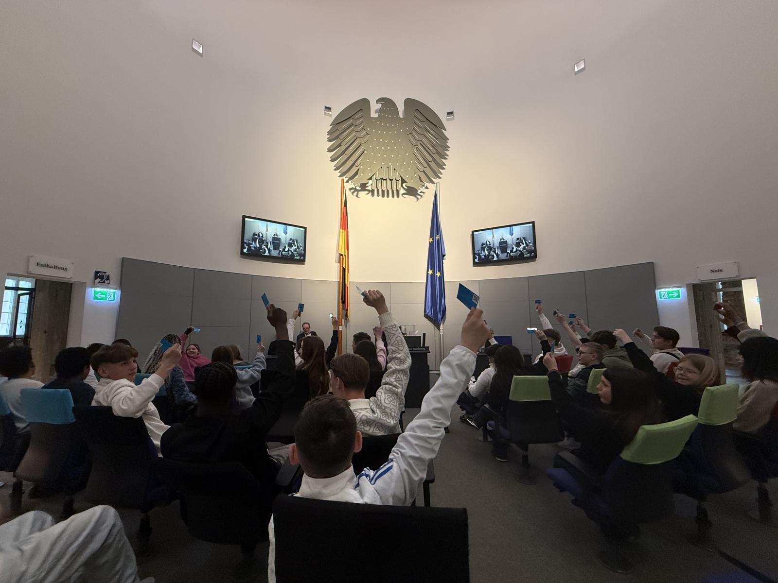 Besonders spannend wurde es in der parlamentshistorischen Ausstellung im Deutschen Dom: Beim „Planspiel“ schlüpften wir selbst in die Rollen von Abgeordneten. Unser Diskussionsthema war das „Verbot von Social Media für Kinder unter 14 Jahren“. Hier mussten zunächst Pro- und Kontra-Argumente gesammelt und das Ganze zu einer überzeugenden Rede zusammengeschrieben werden. Ein besonderes Lob geht hier an unsere Mitschülerinnen und Mitschüler, die den Mut hatten, nicht nur vor vertrauten Gesichtern in einem Nachbau des Bundestages eine Rede zu halten.